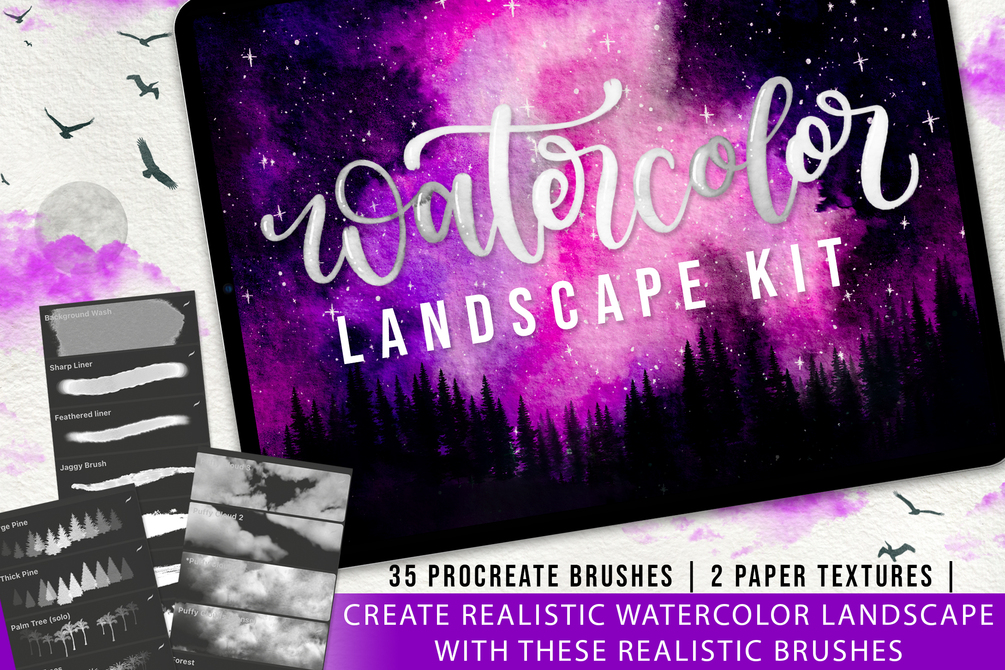 Create realistic watercolor landscape paintings in Procreate with this brush set. This purchase includes 35 drawing, painting and stamp brushes, 1 watercolor paper template file and 1 watercolor paper texture!